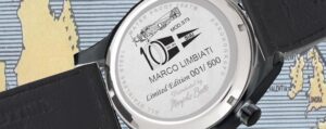 Un Orologio con funzioni Cronografiche ed un Solo Tempo, entrambi al quarzo, il cui quadrante offriva spazio al colorato gagliardetto che ha contradistinto questa scadenza e, sul fondello, i profili di 2 storici aerei della Siai Marchetti: l’S55 (quello di Italo Balbo e della trasnvolata del Decennale) e l’SM79 conosciuto come il ‘Gobbo Maledetto’ che diede popolarità ai Sorci Verdi.